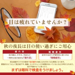 秋は、読書やスマートフォンの長時間の使用で目の疲れを感じる方が多くなります。